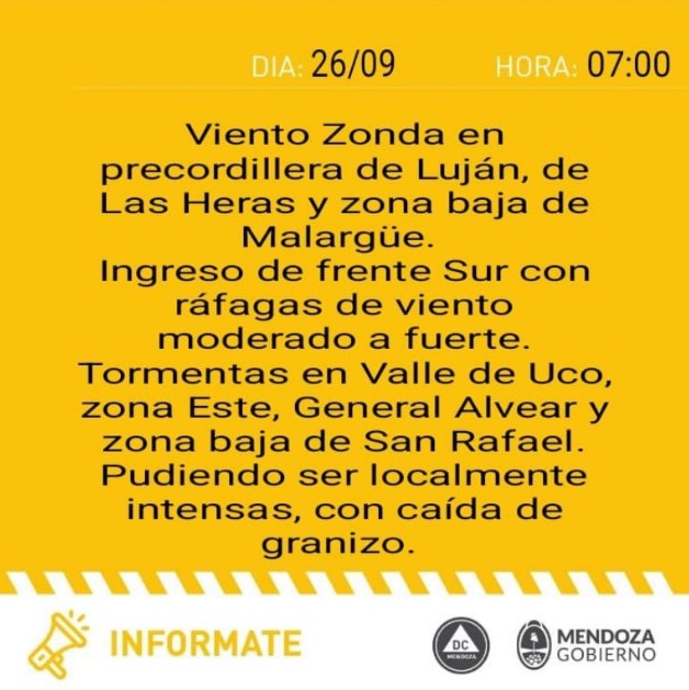 El viento será otro protagonista, con la previsión de ráfagas moderadas a algo fuertes del sector sur. Para la zona de la Cordillera de los Andes, el organismo nacional advierte sobre la ocurrencia de nevadas.