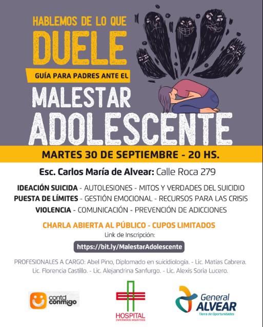 Florencia Merlo desde la Dirección de Familias y Abel Pino del Programa Contá Conmigo, invitaron a la Charla “Hablemos de lo que duele: Malestar Adolescente”, que se realizará mañana en la Escuela Carlos María de Alvear a las 20 hs.