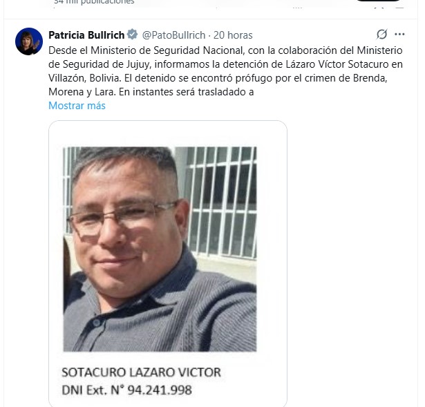 La ministra de Seguridad de la Nación, Patricia Bullrich, confirmó la captura mediante su cuenta de la red social X. Según detalló, la detención fue posible gracias a una coordinación entre la policía de Jujuy, el Ministerio de Seguridad provincial, Interpol Argentina y la Policía de Bolivia. Sotacuro será trasladado próximamente a la División de Investigaciones Federales de la Policía Federal.