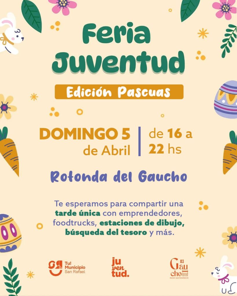 “Este domingo 5 de abril los esperamos desde las 16 a las 22 los esperamos en la Feria Juventud para no perderse, con un especial de Pascuas”, indicó el coordinador de Juventud de la Municipalidad de San Rafael, Julen Rabino.