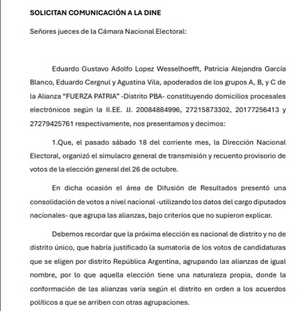 “En mérito a lo expuesto se solicita se haga saber a la Dirección Nacional Electoral que, únicamente, deberá informar los resultados de los escrutinios de los votos de cada distrito electoral, absteniéndose de acumularlos nacionalmente, bajo ningún parámetro, ya que lo contrario no tiene base normativa y genera confusión en la ciudadanía”, concluyeron.