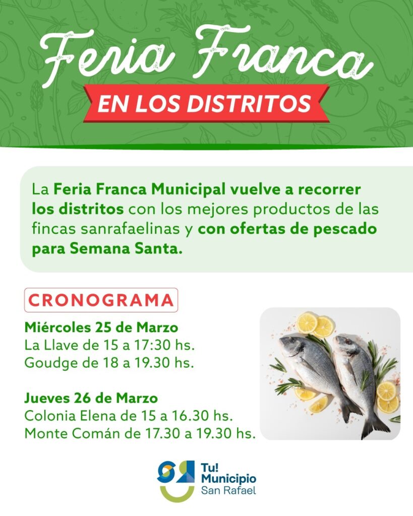 Asimismo, el jueves está confirmada la llegada a Colonia Elena en horario de 15 a 16.30, mientras que, en segundo turno, de 17.30 a 19.30 la feria con las ofertas de pescado llegará a Monte Comán.
