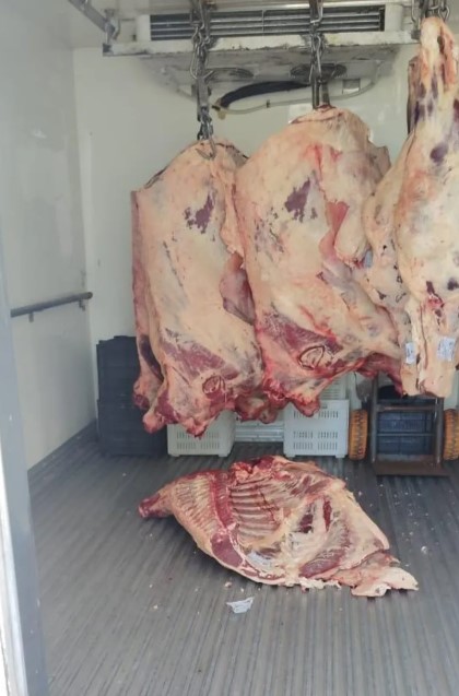 Horas más tarde, en Urquiza y San Francisco del Monte, se inspeccionó un Iveco Daily que transportaba 114 kilos de carne vacuna. Durante el control, se constató que una media res estaba apoyada directamente sobre el piso de la cámara de frío, incumpliendo las normas sanitarias básicas.