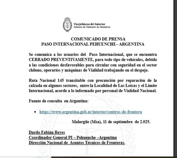El Paso Pehuenche, que conecta Argentina y Chile a través de la ruta 145, se encuentra cerrado al tránsito este jueves 11 de septiembre, para todo tipo de vehículos.