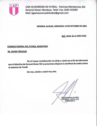 En una carta difundida a través de las redes sociales de la Liga Alvearense de Fútbol, se anticipaba que el combinado sureño podría bajarse del torneo por no contar con el respaldo financiero necesario para afrontar el viaje a Tandil, donde debía disputar la semifinal de vuelta del certamen nacional.